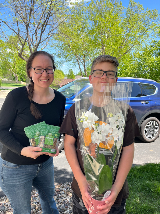 After lunch on Sunday we went to deliver some flowers to Moms/Grandmas. Unfortunately, GG was not home and we woke up Grandpa Kevin from a nap. And then we forgot to get a picture of Grandma Wynne with her flowers (they were white orchids). But we did get pictures with Abby and Loki. And Mom got an orchid, too - hers is yellow and purple.