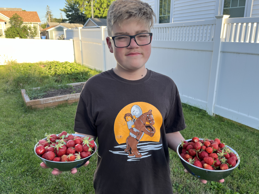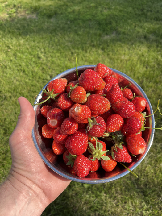 Swimming lessons again today, and we went to the pool for fun. And we picked strawberries. Who knew we could get so many out of such a small part of our backyard.