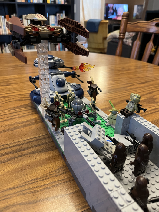 And I built another Kashyyyk battle, this one on a modular platform I was experimenting with. This one has Separatists attacking a Wookie base, with Yoda there to help the defense.