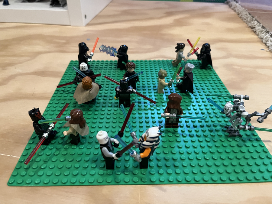 And last, I put together some of my favorite duels from Star Wars all on one base plate. I have Ahsoka vs. Ventress, Qui-Gon vs. Darth Maul, Obi-Wan vs. The Grand Inquisitor, Darth Vader vs. Emperor Palpatine, Anakin vs. Sauvage Opress, Yoda vs. Count Dooku, Rey vs. Kylo Ren, and Obi-Wan vs. General Grievous.