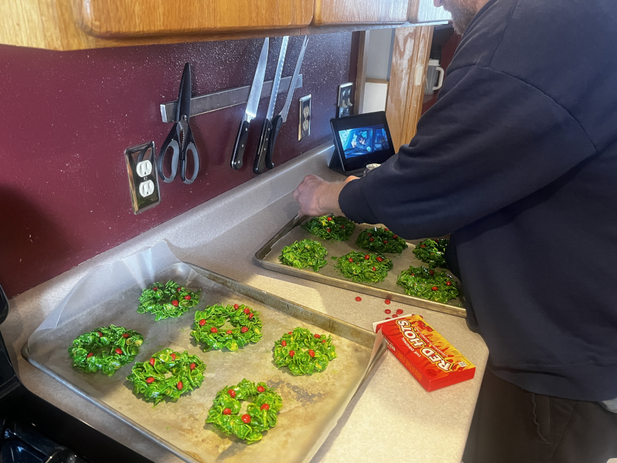 Mom was busy baking for Christmas. She made raspberry thumbprints, iced almond sugar cookies, almond cake, crinkle cookies, wreaths, and pecan tassies. Yum! There may even be some left over for Christmas....