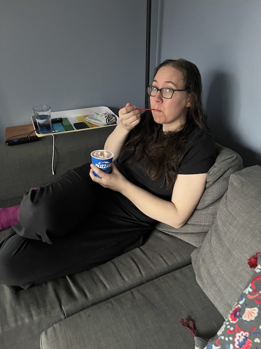 We got some DQ for a treat after all our hard work (well, mostly Mom and Dad did the hard work). I got some, too - but I ate it in the car on the way home. So here's a picture of Mom enjoying her strawberry cheesecake Blizzard - the same one I had. Dad got Butterfinger. Thanks to GG and Grandpa Kevin for the gift card to DQ!