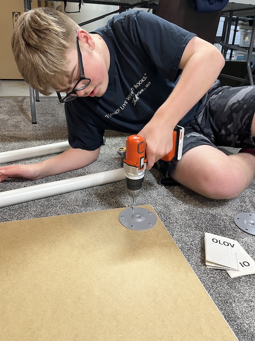 Monday night Dad and I built some shelves together while Mom was cutting and folding and taping dozens and dozens of boxes.
