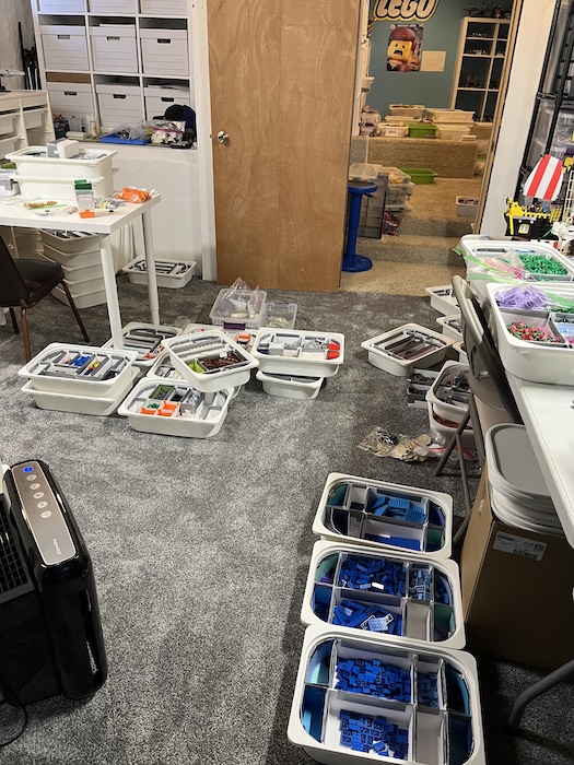 And then it was time to fill all those bins with all the boxes Mom has been making every day - she hit a personal best of over 260 on Sunday! And Dad and I worked in the basement Thursday and Friday nights, all day Saturday, and all day Sunday sorting, and sorting, and sorting...and we are still not done.