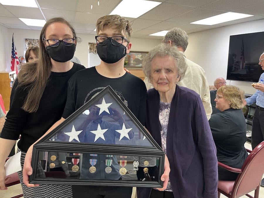 Me, Mom, and Great-grandma Muriel with the flag and Great-grandpa's medals displayed.