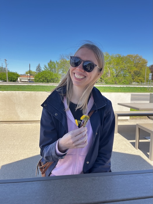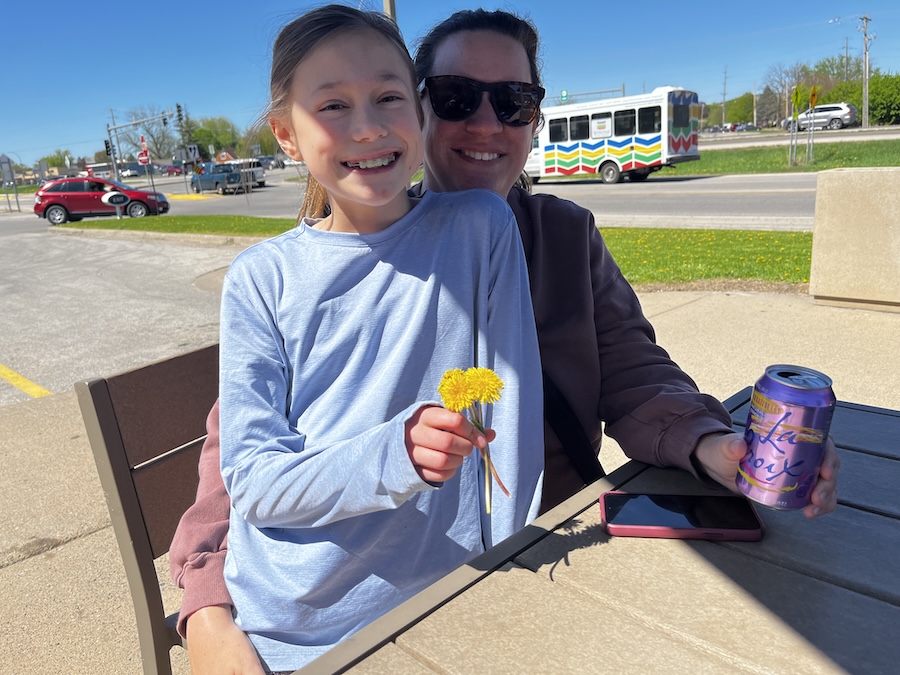 Caroline with the flowers Annika picked. Mom got some, too.