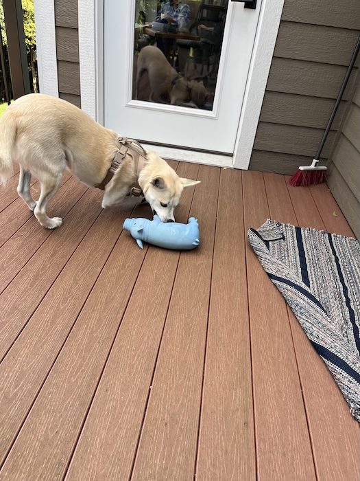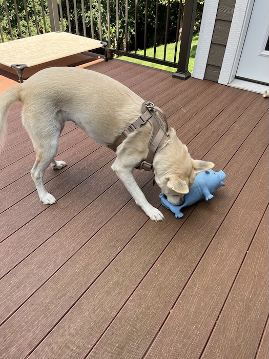 Lily playing with her snorting pig toy.