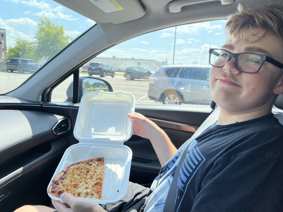 Taking a lunch break for some pizza and a cookie.