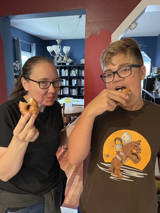 Mom and Dad walked to the farmer's market on Saturday. They picked up some donuts and bread.