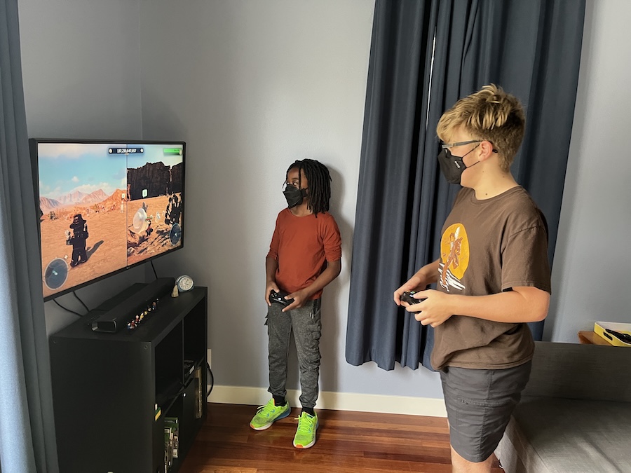 On Saturday morning we all walked to the farmer's market and talked to some people we hadn't seen in a while. Mom and Dad went to get more gorceries after we got home. While they were out, a piece of the Black Pearl fell off and got caught in the mechanism that makes the cannons come out. Mom and Dad worked on finding it for a while and eventually tore off some big chunks of the ship before they located the problem. I was worried it was not going to work, but it all went back together and the cannons worked again. In the afternoon, Anthony came over to play video games. We had a little trouble getting the game loaded on the XBOX, but then we had a lot of fun.
