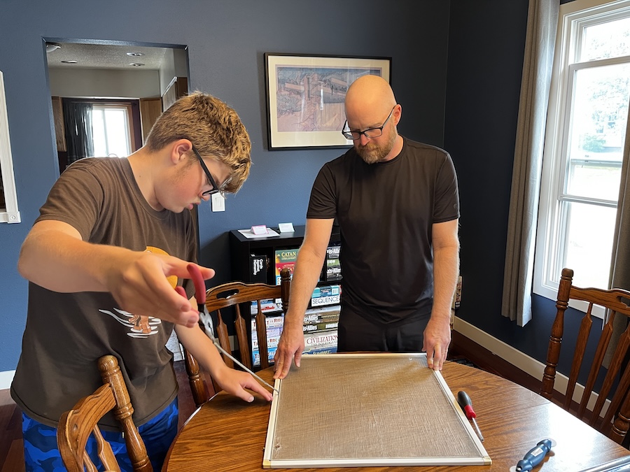 Sunday was kind of a work day. Dad and I went on a bike ride, then we fixed a screen, I mowed the lawn, learned how to use the air compressor, and then I helped make supper.