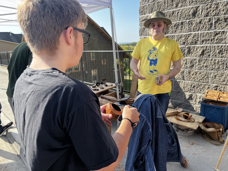 Talking to the guy who carves spoons and cups out of wood - I am holding a cup in my hands.