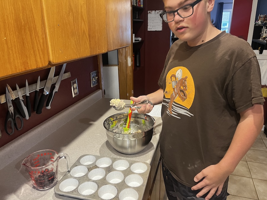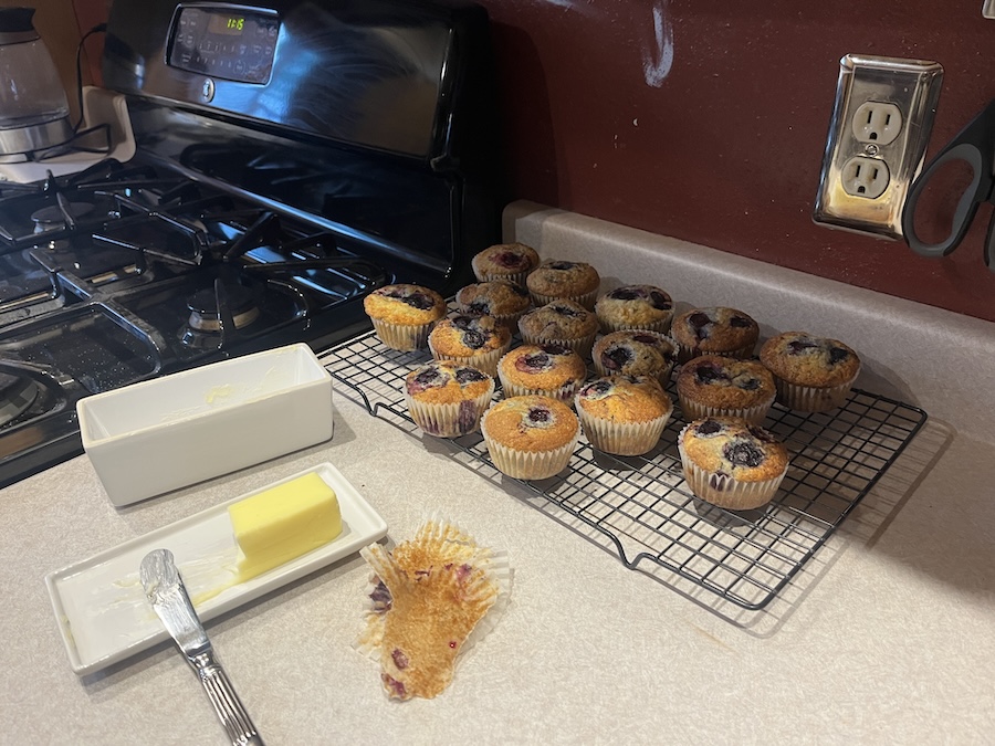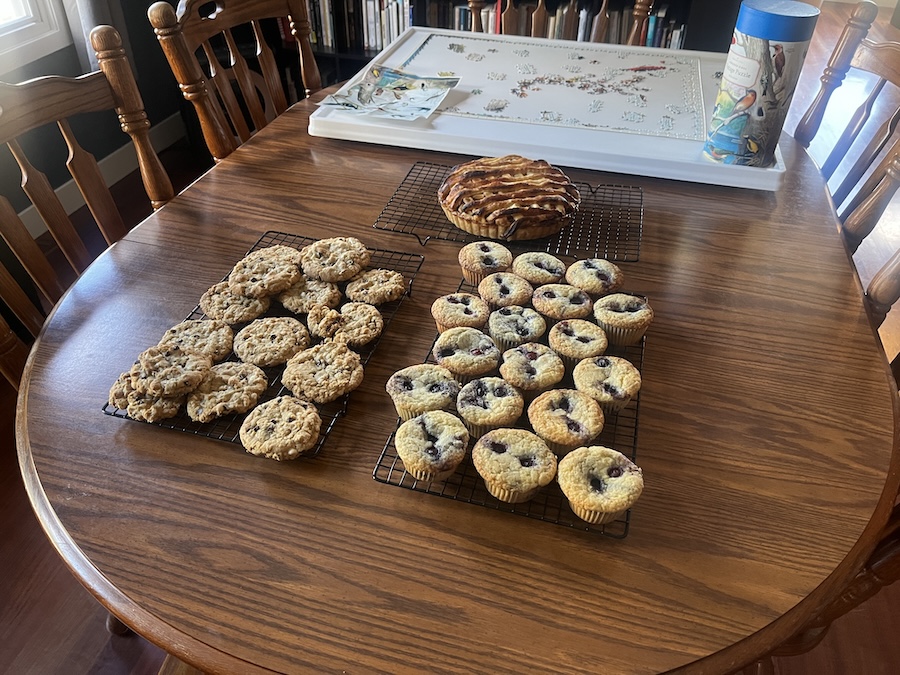 Sunday we finished getting ready for Bob's visit by making some tasty things to eat. Mom and I made apple pie and more blueberry muffins. And Dad wanted some chocolate chip cookies, so Mom made those, too. And she also made mashed potatoes and fresh from scratch biscuits, hamburger gravy for Bob, and the mushy peas. It was a lot. Mom is amazing.