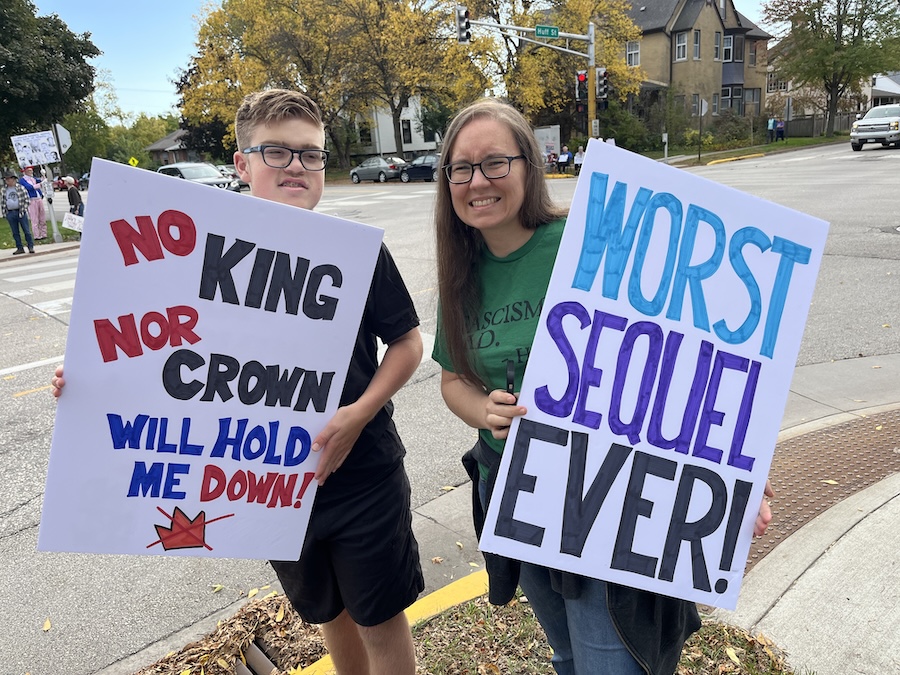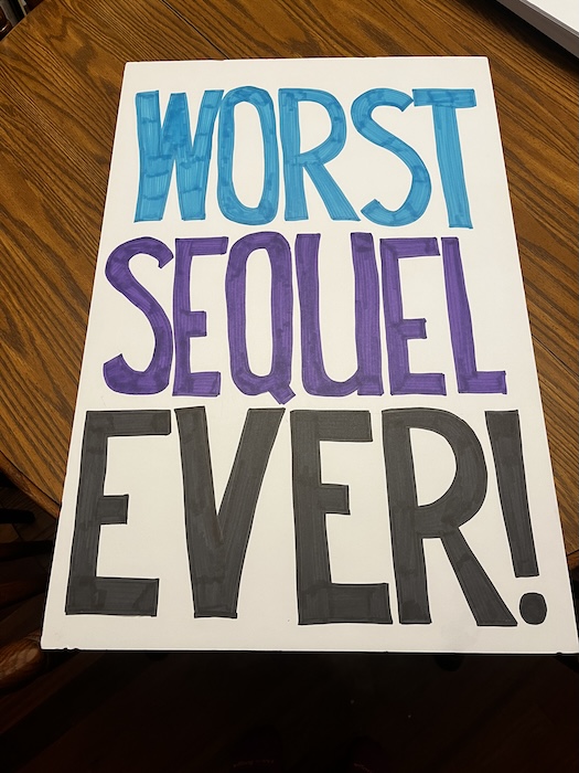 Our signs in action - Mom's "Worst Sequel Ever" was the most popular - lots of people wanted pictures of it.