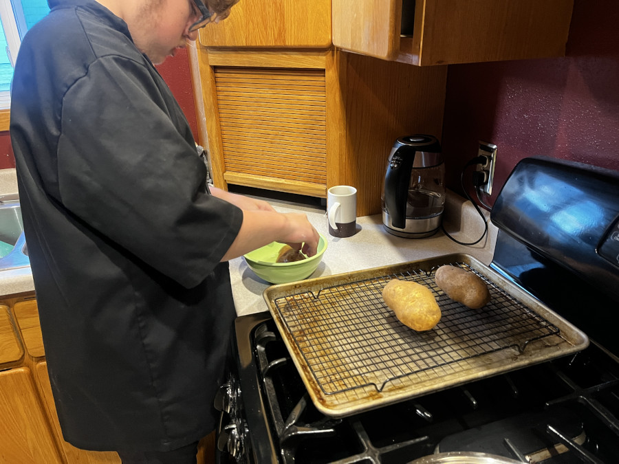 Prepping the baked potatoes.