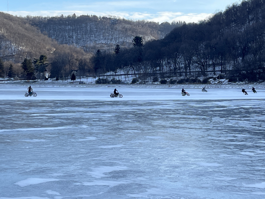 Motorcycles racing on the lake.