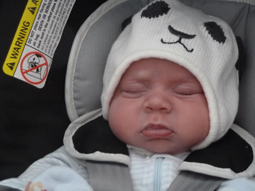 Daddy and I took Duke for a walk around the lake once we got home. I wore my panda hat. You may remember that it was part of my going home outfit and that it was much too big for me. It is still a little big, but I am growing into it fast.