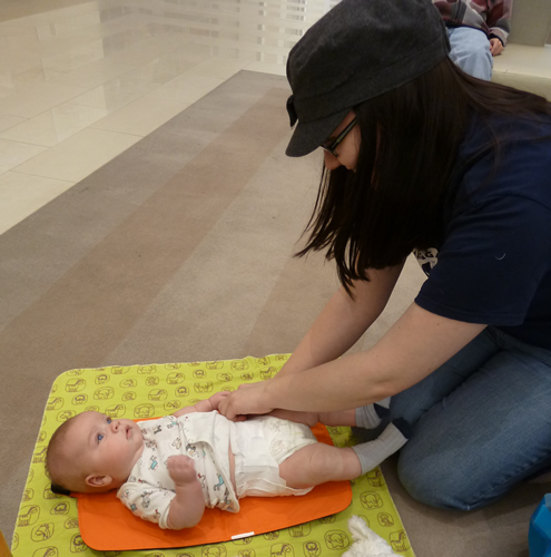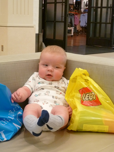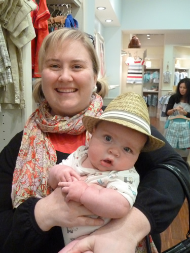 Shopping with Auntie Kara. She likes to put hats on babies.