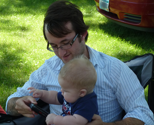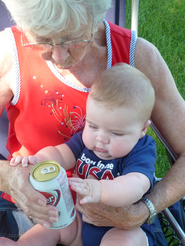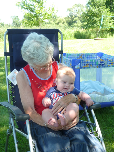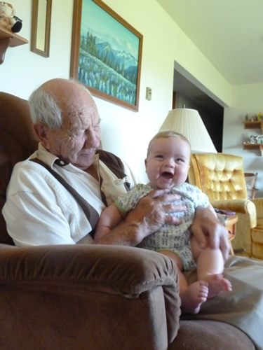 On Saturday we went west to visit family for the weekend. I saw Grandma Wynne for a few minutes when we dropped Duke off at her house, and then we went to see Great-grandma Muriel, Great-grandpa Les, Grandma Gail, and Grandpa Kevin. I slept most of the way, but we did have to stop for me to eat. Dad sat on the grass in the shade at a gas station and fed me.