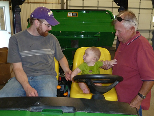 Me and Daddy in one of the tractors. I'm on the buddy seat. Daddy said there were no buddy seats when he was little, so he had to sit on an upside-down five-gallon pail.