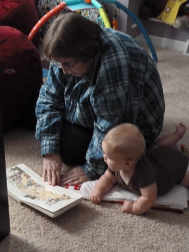 Grandma Wynne making the book make noise. I hope I learn how to do that some day.