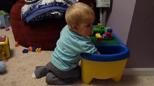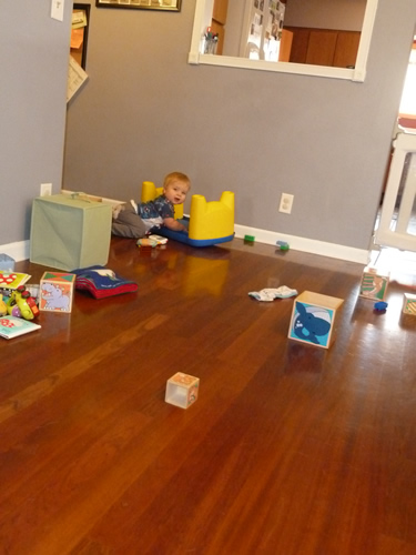 I love to play with stuff now that I can move around so well. Mommy puts out toys for me and I wander all over the dining room examining things.
