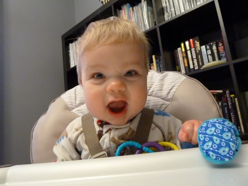Very excited about something. Probably food, since I am sitting in my eating chair.