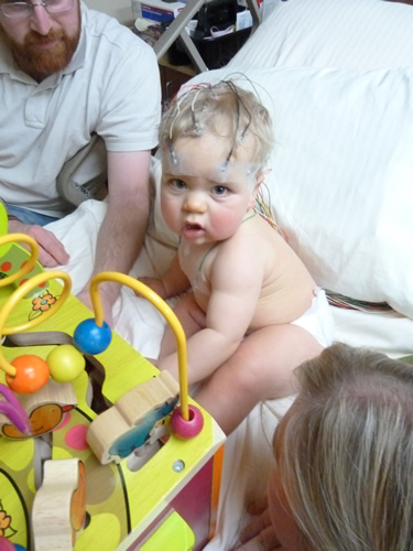 On Tuesday, I went to have another EEG - this one lasted SIX HOURS. Auntie Kara came along to help Mommy and Daddy keep me occupied. It wasn't so bad, I guess. I still had red marks and glue in my hair from last time, so Jaime didn't have to measure and mark up my head again. The only problem was that the glue wasn't sticking to my forehead, so Jaime had to tape the electrodes down. After all that, sitting around was a breeze. I even got a new toy - a big wooden busy box.