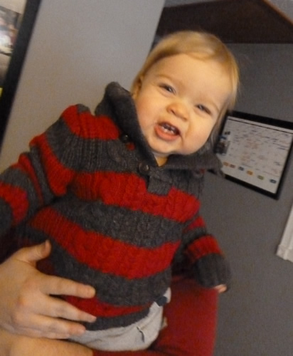 Here I am in my new sweater - aren't I cute? You can't see it in the picture, but the sweater has leather patches on the elbows. (Thanks Matt and Jenny! Sorry you couldn't make it.)