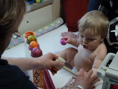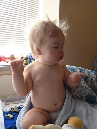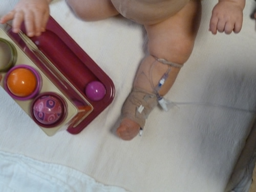 On Wednesday, I went to the emergency room because my temperature was high, I was coughing and not eating or drinking, and crying all the time. I had some more blood drawn and an x-ray. Turns out I had a fever, an ear infection, pneumonia, and I was dehydrated. The nice doctor gave me another shot, and squirted some medicine in my mouth. I was feeling and looking much better, so Mommy and Daddy took me home.
