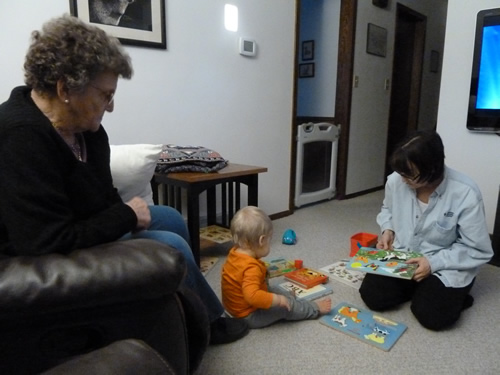 Playing with puzzles with Great-grandma Darlene and Grandma Gail.