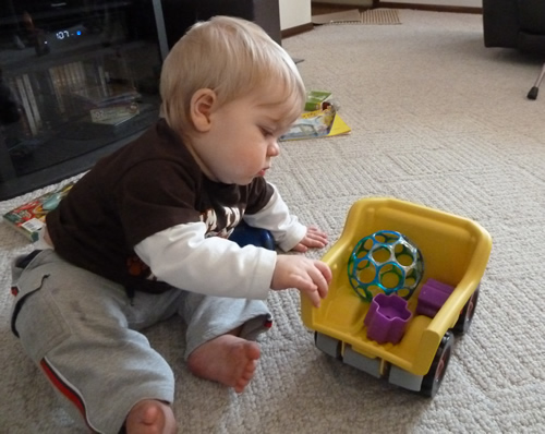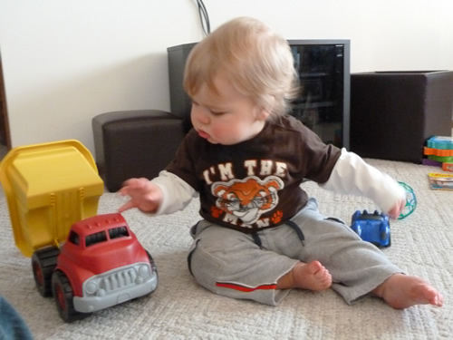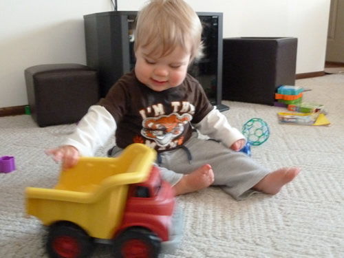 On Sunday afternoon, Daddy came back - and he brought me some toys! He brought me a dump truck and a blue race car and a teething ring and some plastic cups for me to drink out of. I love my new toys!