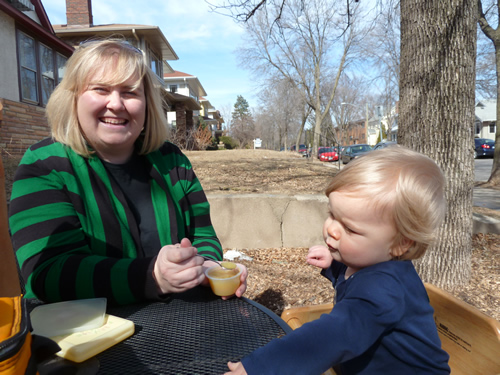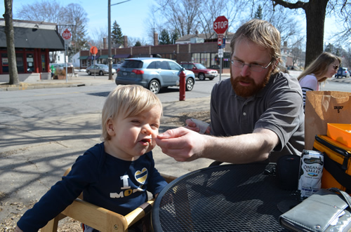 After the museum we took Mommy to get her haircut. Traffic was really bad, so we almost didn't make it in time and I ended up eating lunch late. But that was okay because I got to eat outside! In the sun! Daddy and Auntie Kara had lunch with me at a little corner bakery.