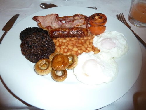 Mommy's breakfast - haggis and black pudding.