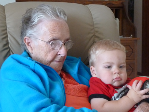 Daddy really wanted me to sit in Great-grandma's lap so he wouldn't have to keep chasing me around the house, but there are so many things to see and touch at her house I couldn't sit still for very long.