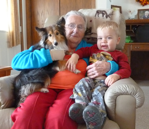 Sunday morning I went to see Great-grandma Dorothy with Daddy. She was watching Brandi, which is cousin Pete's dog. Brandi wasn't to sure about me, but we did manage to get a picture.