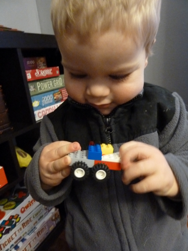 Hi everyone! This week I played with LEGO every day, sometimes more than once, with both Mommy and Daddy. We built a lot of towers - and I knocked them all down. I also played with regular LEGO this week, after I dumped out Dad's Creationary game. Mommy helped me use the pieces to build something.