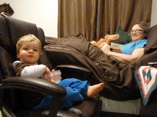 And I had some visitors - well, they came to see Grandma, too. Diane came on Saturday, and so did David (but he left before I got up from my nap). On Sunday, David brought Great-grandma Dorothy and Billy over to see me. I had fun entertaining them.