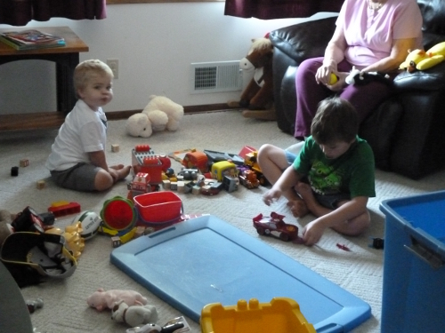 Great-grandma Darlene, Max, and Bradley came over to Grandma Wynne's on Sunday. Max and I played with all of my toys.