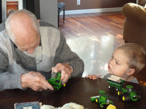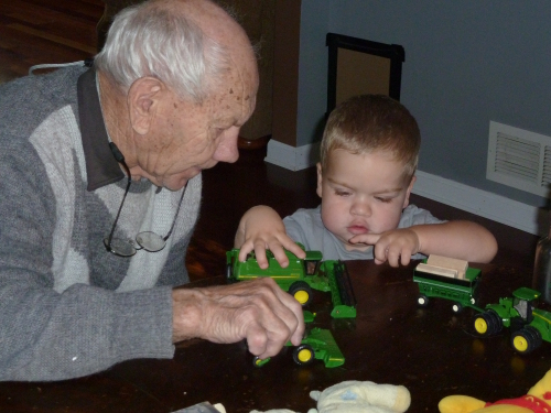 I stayed in the house all morning. Great-grandpa Les and I did some farming.