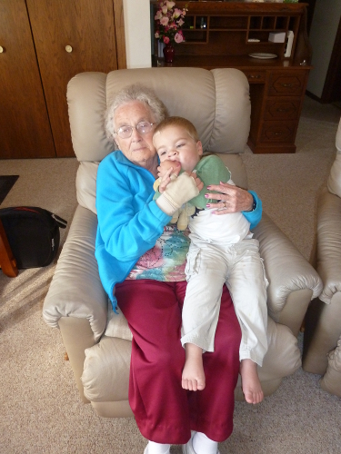 Grandma Gail, Great-grandma Muriel, and Great-grandpa Les all came to visit while we were having the sale. They took turns playing with me inside. Duke also had some excitement when a box of donuts was left where he could get at them. He ate 4 1/2 blueberry donuts. One more feat of eating to add to his impressive list (a whole pizza, a loaf of challah bread, a package of English muffins, a stick of butter, a bag of lemon drops).