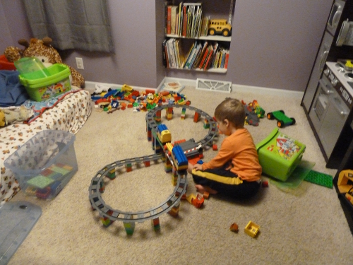 As promised, more LEGO action. Mommy and Daddy have ben competing to see who can make the most amazing train layout. Mommy did a figure-eight.