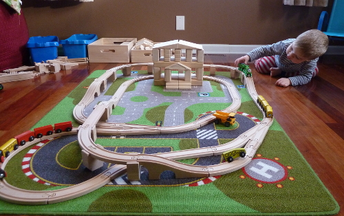 Mommy was doing some volunteering this week, so Daddy and I spent our time reading Curious George and playing. I brought out my wooden train set to go with my new blocks.