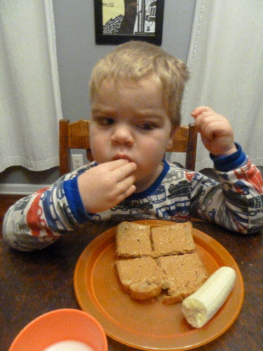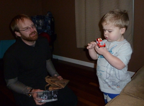 Mommy and Daddy were both doing some volunteer work on Saturday, so Grandma Wynne and Grandpa Al came to visit with me. We played with my trains and my blocks, we read some books and watched some Curious George, but we had the most fun with my excavator and my flatbed trailer. Daddy put new batteries in the excavator and Grandpa showed me how to get it to drive off the trailer all by itself. That was so exciting I had to do it again and again and again.