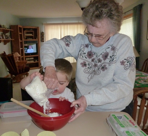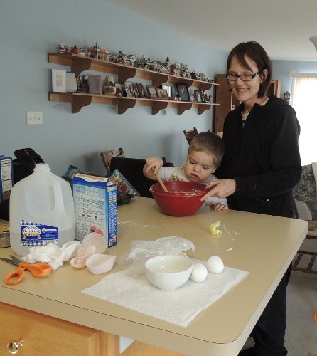 Saturday morning I went to Great-grandpa Les and Great-grandma Muriel's house to visit with them and Grandma Gail. GG had a present for me - a Curious George backpack! With a Curious George book in it! And we made cupcakes!