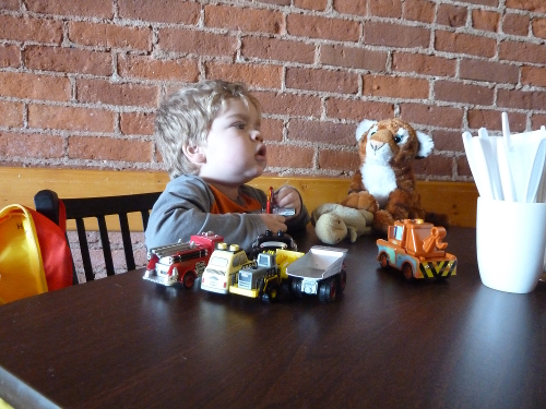 Mommy had homework to do on Sunday, so Daddy and I spent the day together. We saw a train in the morning when we walked Duke - and the engineer honked the horn for me when I waved. When we got home, Daddy cut my hair while Mommy held my hand, then he helped me build a LEGO tractor. We played with Play-Doh, ate lunch, and then I took a nap. After nap I rode my bike and rode in the wagon. We watched Cars, ate supper, and took Duke for a walk again. Sunday was a full day.