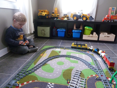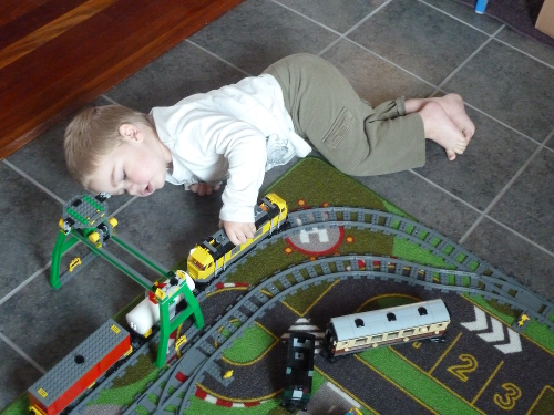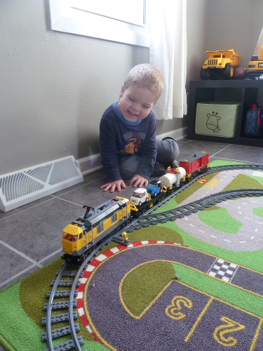 I had a good week in school, and then we had Friday off. Daddy stayed home with me while Mommy went to class. I remembered there was a LEGO train in the basement and Daddy went to get it for me. We had a lot of fun once Daddy put the new batteries in the motor. And I got to run the train with the remote control!