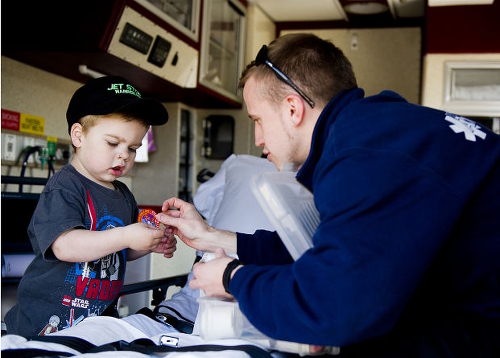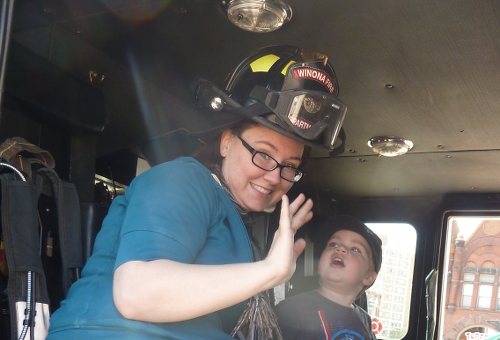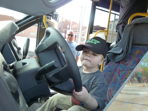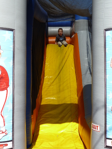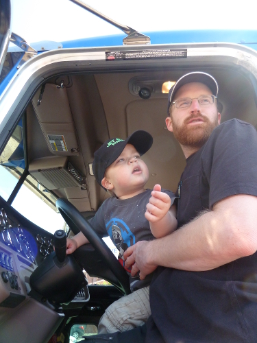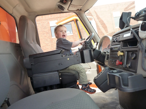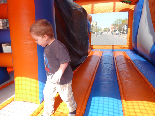 Running the remote control for the LEGO train. Hooking up the train cars. Saturday morning we went downtown to see some trucks. The public parking lots downtown had trucks parked in them and I got to sit in almost all of them! And honk their horns! No foolin' - and no one got mad at me for honking the horns, either (even the air horns). I also got to go in a bouncy house for the first time. It won't be the last. In the crane truck, with Daddy standing by. Driving the bus. In the bouncy house. Ready to go down the bouncy house slide. Checking out the Peterbilt milk truck with Daddy. Some of you may have seen my picture in the paper - here is a picture Mommy took of me getting my picture taken by the newspaper photographer (he's on the right - the guy on the left is Daddy). In the ambulance, getting my picture taken for the local paper. And this is the picture of me on the website - I don't know yet if I made the print paper. The picture from the non-Mommy photographer. Back to trucks... Watching the ladder truck with Daddy. Sitting in the fire truck. Mommy tried on the fireman hat. Driving the orange snow plow truck. After some dinner and a nap, we went to visit our friends Rosa, Bonnie, and Adam. I played with Rosa while Mommy and Daddy talked. And talked. And talked. I played with Mommy on Sunday morning while Daddy went in to work for a few hours. I rode my bike and went to check out the excavator a block from my house (I've been checking up on it a couple of times a day all week). We found out a new house is going to be built on the spot where the old house was torn down last week. Daddy watched me in the afternoon while Mommy studied for a test. We spent the time outside - we went for a walk with the wagon and I went down a big slide and then played in a sandbox with my friend Maggie. Then we took Duke for a walk. Here are a couple of pictures from my wagon trip. I persuaded Daddy to let me pull the wagon. Pulling my wagon. Off we go... Right after the second picture was taken I fell down and scraped my elbow. I didn't even notice it until Daddy grabbed my arm to take a look at it - I just got back up and started pulling the wagon again. And that was it. Daddy says we get to go to Bob and Jenn's house in a little over a week. But I don't know what a week is.... Hopefully it's not too long. Take care!