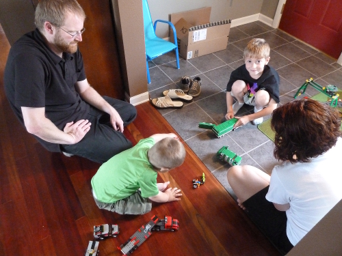 Showing Angie and Sawyer my trucks and trains.