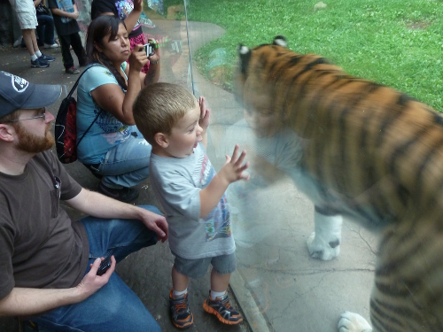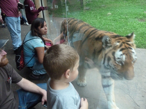 The first time we went to the tiger lair the tiger was sleeping. The second time he was walking back and forth in front of the glass.